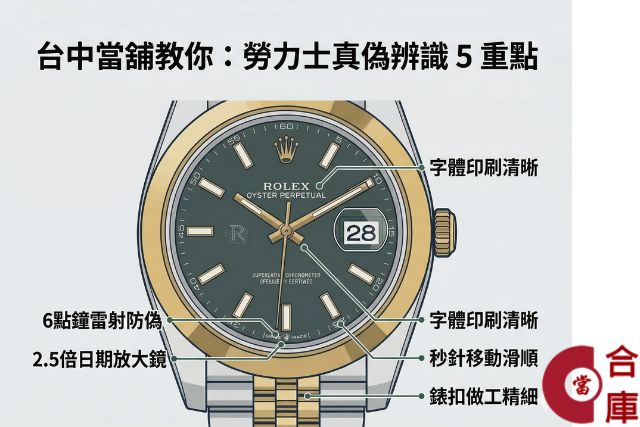 擁有勞力士是身分地位的象徵,款式永不退流行,在二手市場價格波動小,一只錶可以受到如此歡迎,甚至出現高仿山寨品,在購買二手勞力士時,要如何分辨真假成了購買人第一個要學會分辨的課題,由經常辦理台中手錶借款,閱錶無數的合庫當舖來教你如何分辨真錶。